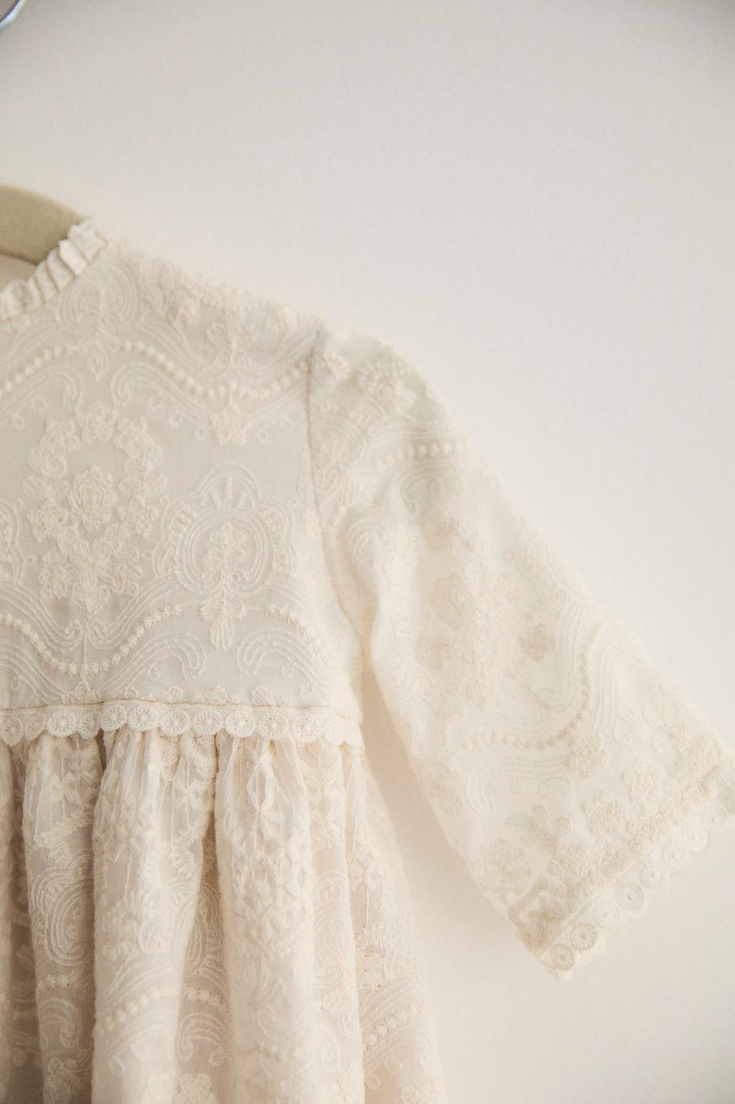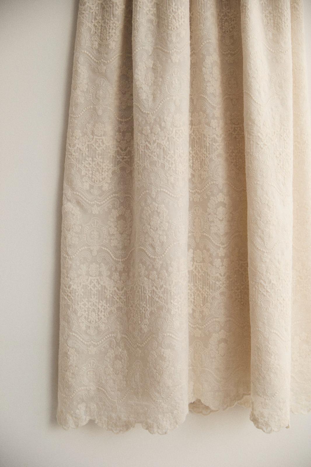 Rematado en el pecho, cuello, mangas y bajo con puntillas valencienne.