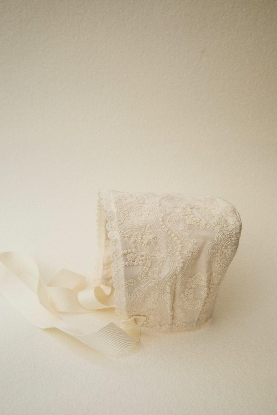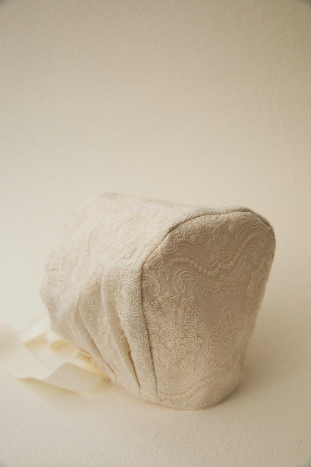 Faldón de bautizo tradicional en seda natural bordada con algodón.